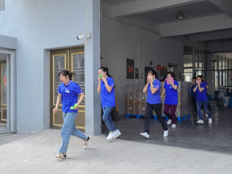 隨著單元樓火警警報聲響起,車間員工迅速從安全樓梯疏散,低頭彎腰同時用手或濕毛巾捂住口鼻迅速往安全通道撤離。